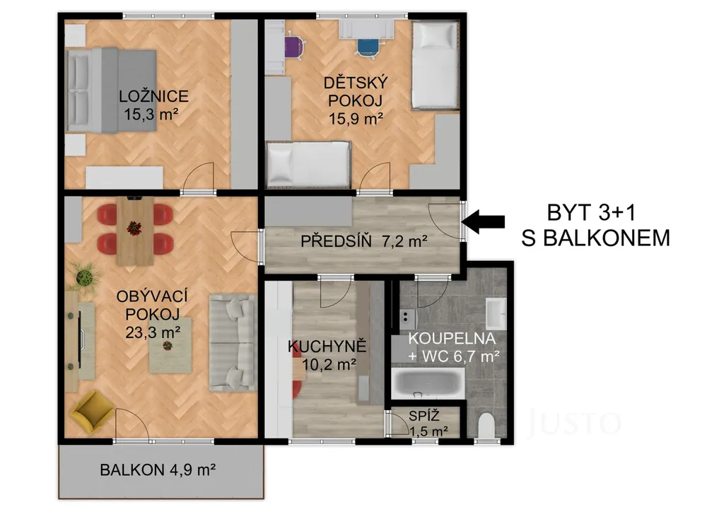 Byt disponuje užitnou plochou 80,1 m², dále k bytu náleží balkon o výměře 4,9 m², prostorný sklep 6,2 m² a společné prostory bytového domu.