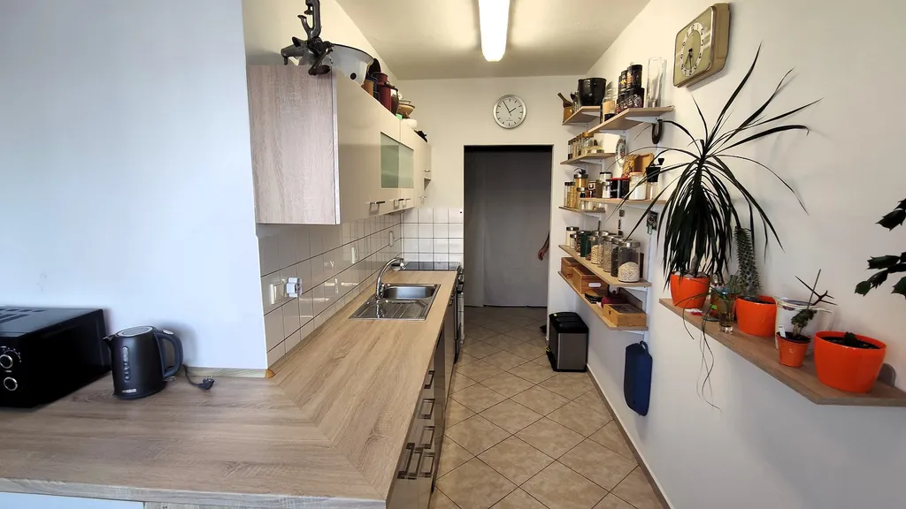 Kuchyňská linka je plně vybavena – k dispozici je sporák s troubou i mikrovlnná trouba a myčka nádobí. Byt nabízí také velkou šatnu, která poskytuje dostatek úložného prostoru. K bytu náleží sklepní kóje.