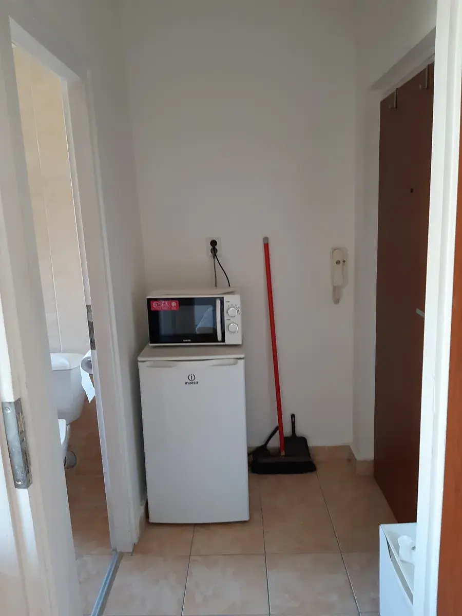 obytný prostor 15 m², koupelna se sprchovým koutem a pračkou (4 m²), předsíň (2 m²); kuchyňská linka, plotýnkový vařič, mikrovlnná trouba, lednice, postel.