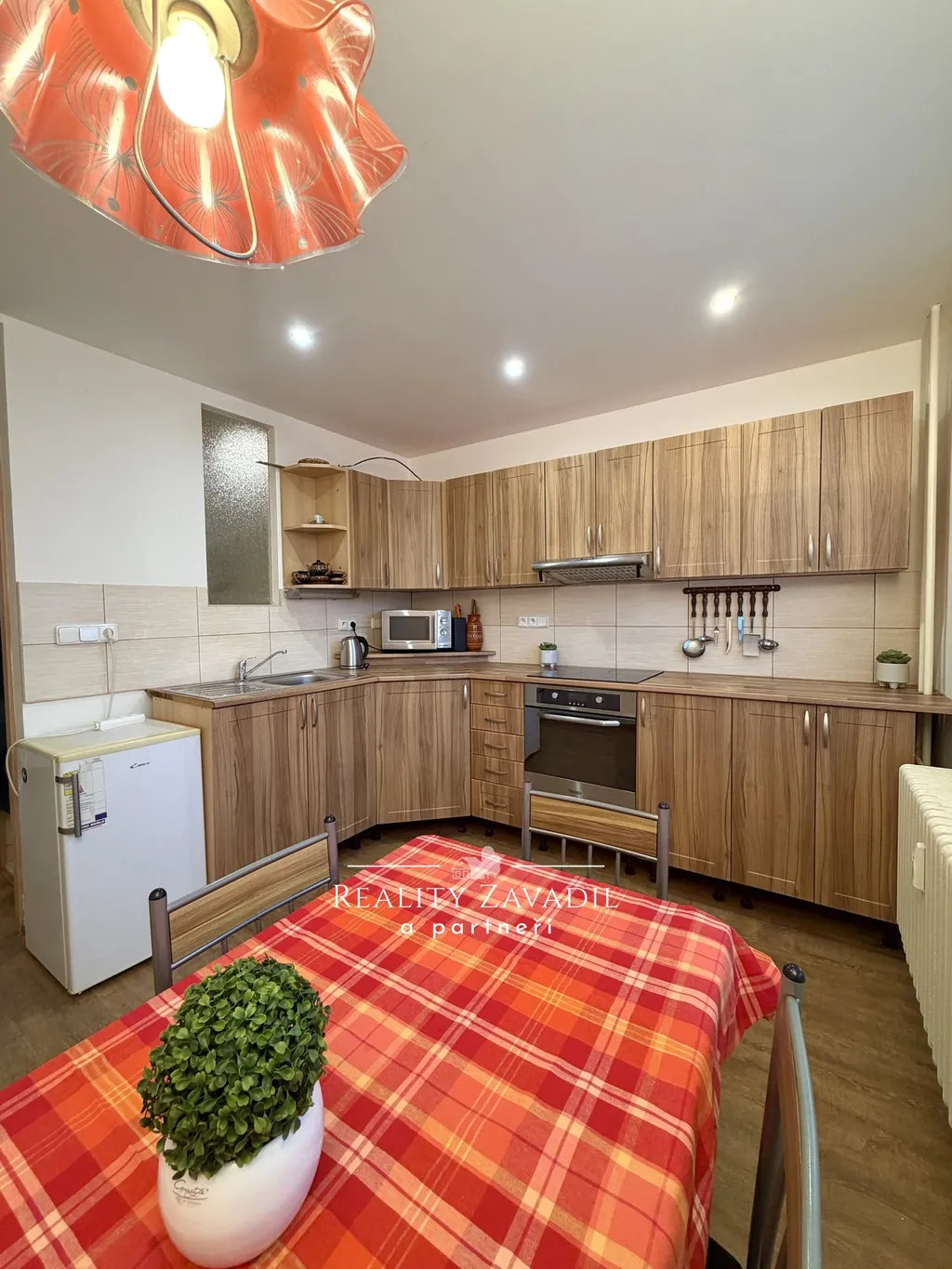 Obytná část se skládá z prostorného obývacího pokoje, který je plně zařízen obývací stěnou, televizí, konferenčním stolkem a sedací soupravou s křesly. Druhou místností je samostatná kuchyně s rohovou kuchyňskou linkou, jež nabízí dostatek úložného prostoru. K dispozici je zde elektrický sporák s troubou, mikrovlnná trouba a jídelní stůl se židlemi. Byt se pronajímá bez chladničky, což nájemci umožňuje zvolit si spotřebič dle vlastních preferencí. Významným benefitem pro uložení sezónních věcí je praktická komora umístěná v mezipatře domu. Vytápění i ohřev vody jsou řešeny dálkově.