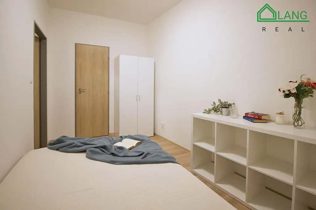 Útulná ložnice je plně zařízena policovým úložným prostorem, šatní skříní a velkou postelí. Stačí si jen donést kufr.