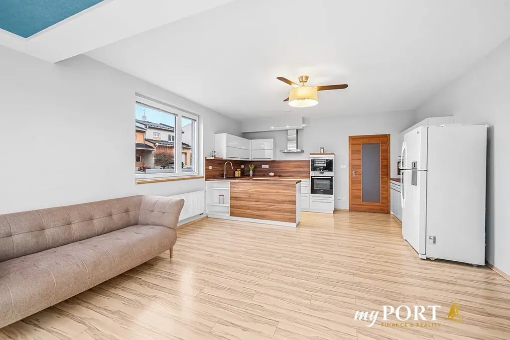 • Obývací pokoj s kuchyňským koutem a s přístupem na terasu. Kuchyňská linka s praktickým ostrůvkem je vybavena spotřebiči Siemens: myčkou, troubou, parní troubou, mikrovlnou troubou, a lednicí LG.