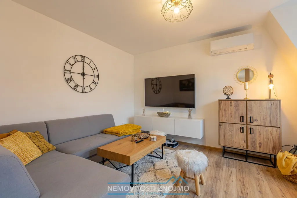 b.) obývací pokoj se sedačkou, konferenčním stolkem, TV stolkem, komodou, smart televizí, klimatizací a křeslem