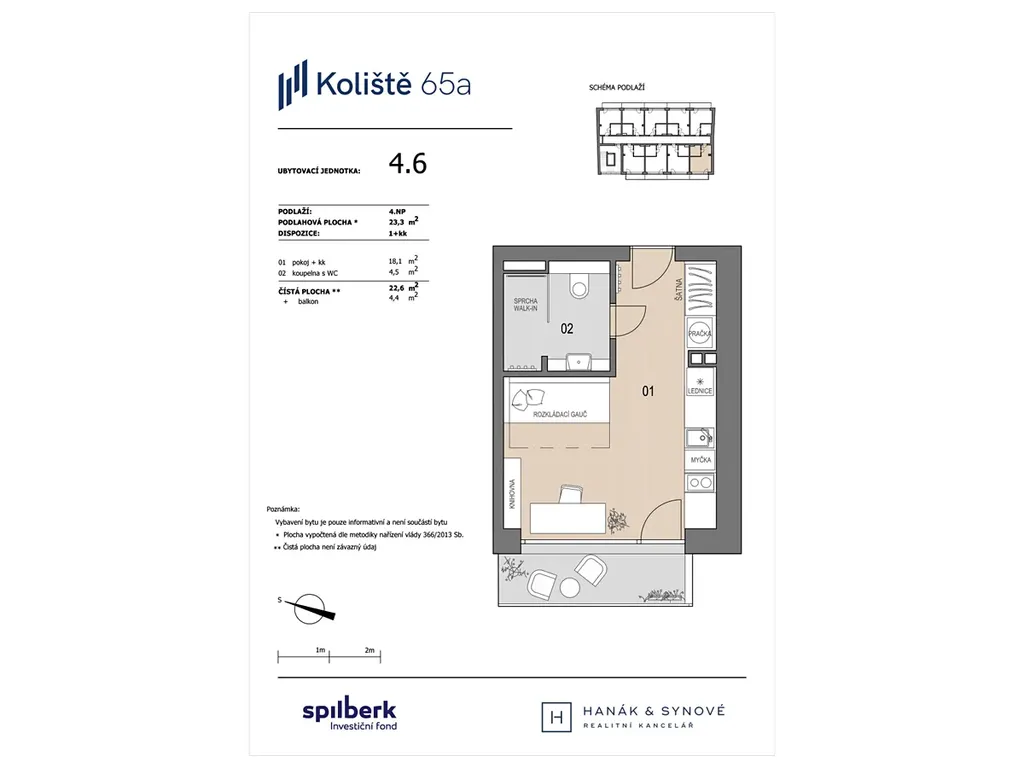 K dlouhodobému pronájmu Vám nabízíme zcela nový, krásný, světlý, moderní byt 1+kk v osobním vlastnictví v novostavbě bytového domu na ulici Koliště, Brno. Byt o ploše 23,3m2 je umístěn ve 4.NP cihlového domu s výtahem a je orientován do klidného vnitrobloku a náleží k němu balkón o ploše 4,4 m2.