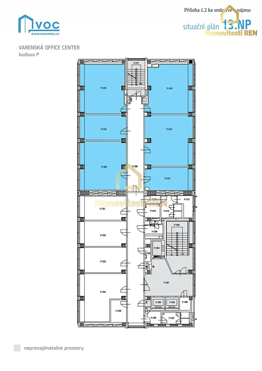 Jedná se o oddělený kancelářský celek, který tvoří 4 kanceláře o velikosti cca 40 m² a 2 kanceláře o velikosti cca 20 m², doplněné o společné prostory – chodbu a sociální zázemí.