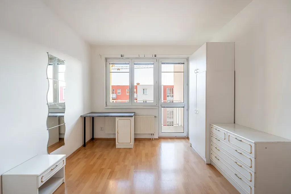 Za vstupem do bytu najdete prostornou předsíň s vchodem na samostatné WC, do koupelny s vanou, dále do pokoje (ložnice, pracovna) s balkonem a do druhého (obývacího) pokoje s kuchyňskou linkou.