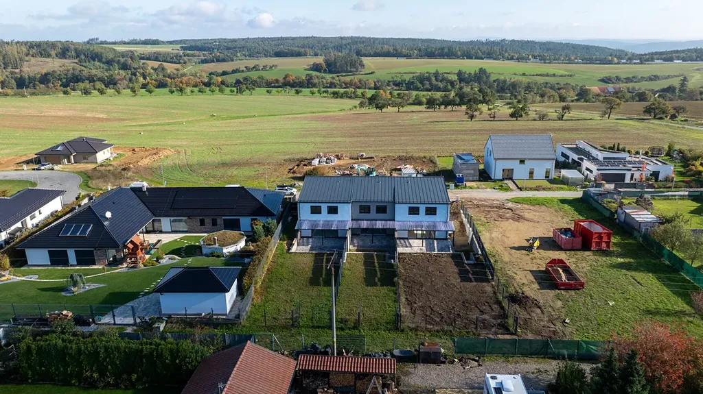 Dům je těsně před kompletním dokončením na klíč vyjma finálního povrchu podlah (vinyl, plovoucí podlaha atd.), obkladů, dlažby a sanity v koupelně a interiérových dveří.
