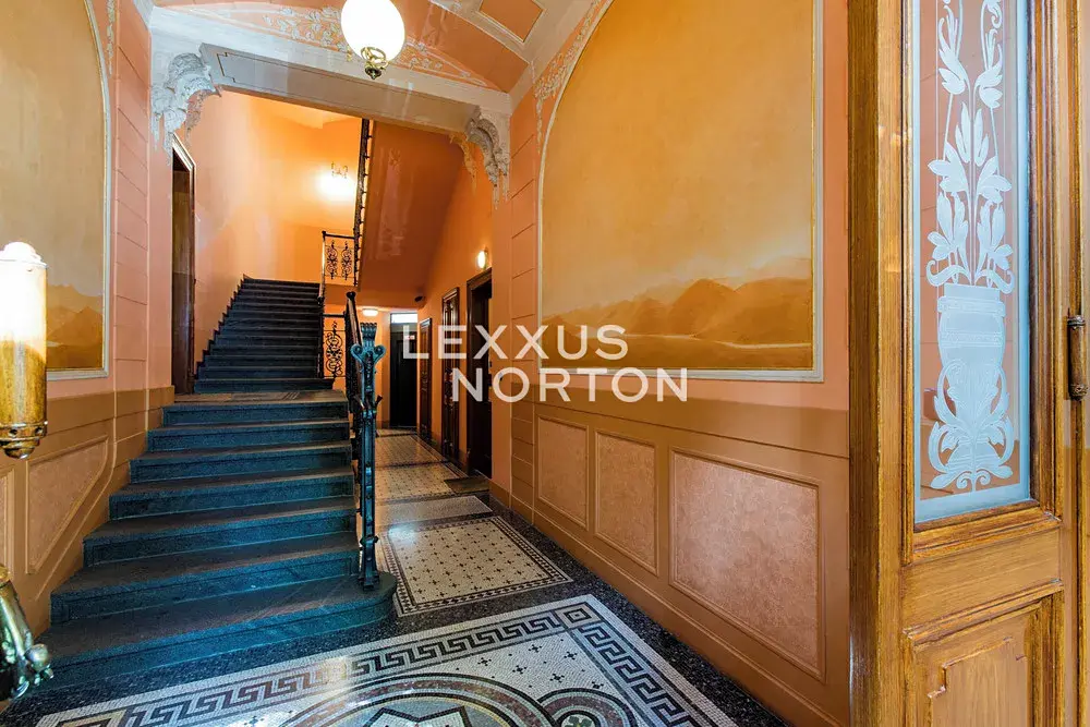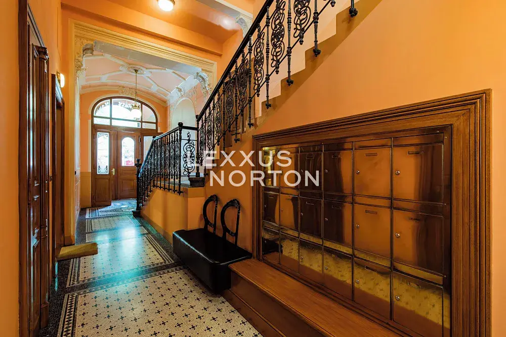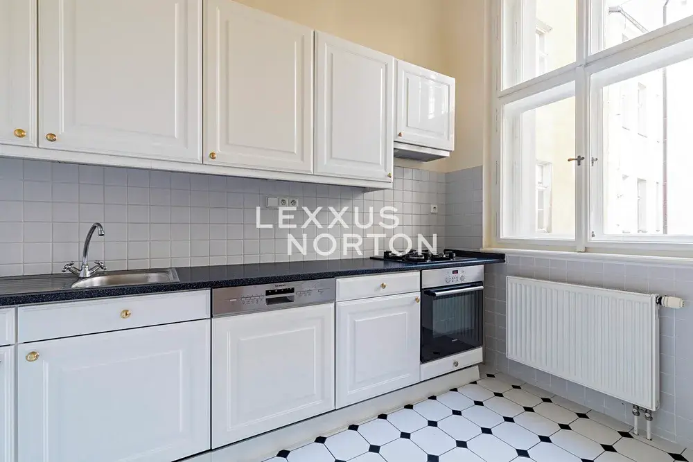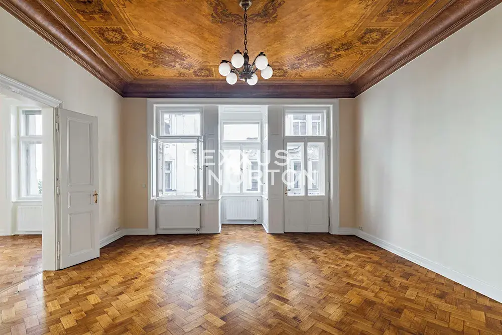 Nabízíme k pronájmu nezařízený luxusní byt 4+1 o velikosti 151 m2 a dvěma balkony, který se nachází ve 3.NP bytového domu s recepcí. Nemovitost disponuje vstupní halou, obývacím pokojem (34 m2) s arkýřem, historickou stropní malbou a vstupem na balkon, kuchyní, jídelnou se vstupem na druhý balkon a do komory, třemi ložnicemi (26 m2, 24 m2 a 18 m2), koupelnou a samostatnou toaletou.