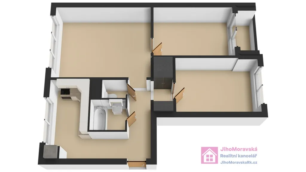 Dispozice bytu: předsíň, chodba, kuchyň, koupelna (vana, připojení na pračku), toaleta, jeden samostatný pokoj a dva průchozí pokoje a lodžie. V 1. podzemním podlaží bytového domu je umístěna sklepní kóje. Půdorys bytu naleznete ve fotogalerii.