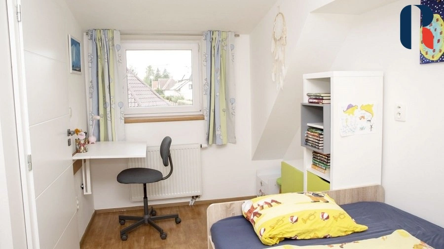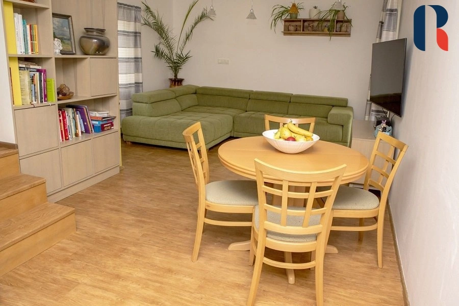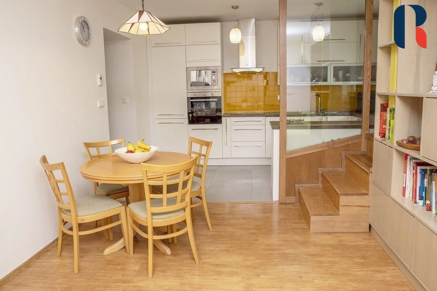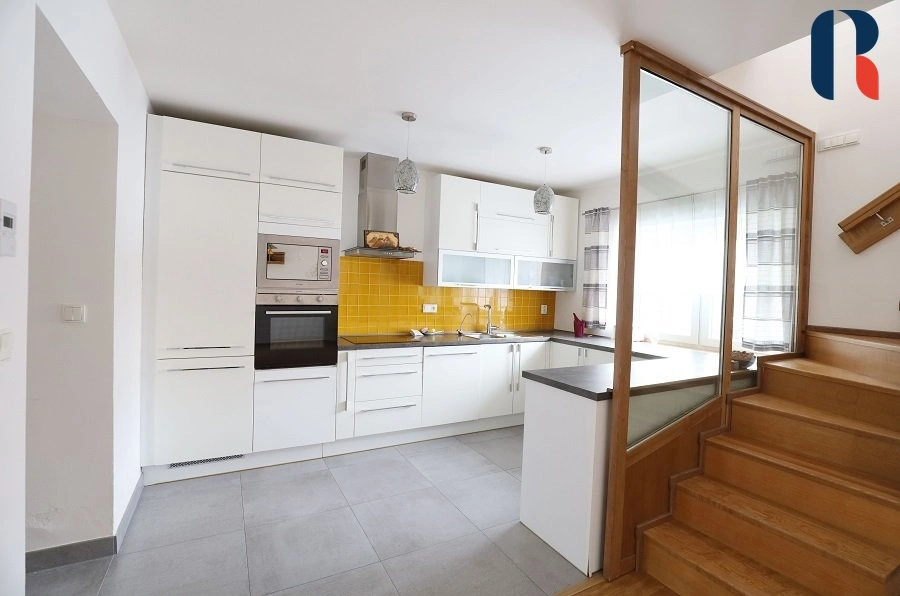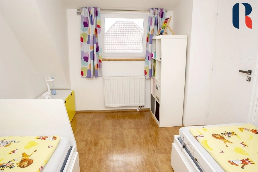 Samostatně stojící patrový dům 4+kk s podlahovou plochou 97 m2 disponuje 4 samostatnými pokoji, 2 koupelnami s wc a technickou místností. Interiér je prakticky dispozičně řešen, aby bylo využito každé místo ( vybavení na míru, vestavěné skříně), dům tak působí prostorně a zároveň útulně. Velkou výhodou je dostatek přirozeného světla v celém domě, ticho a přímý vstup z obývacích prostor na zahradu.