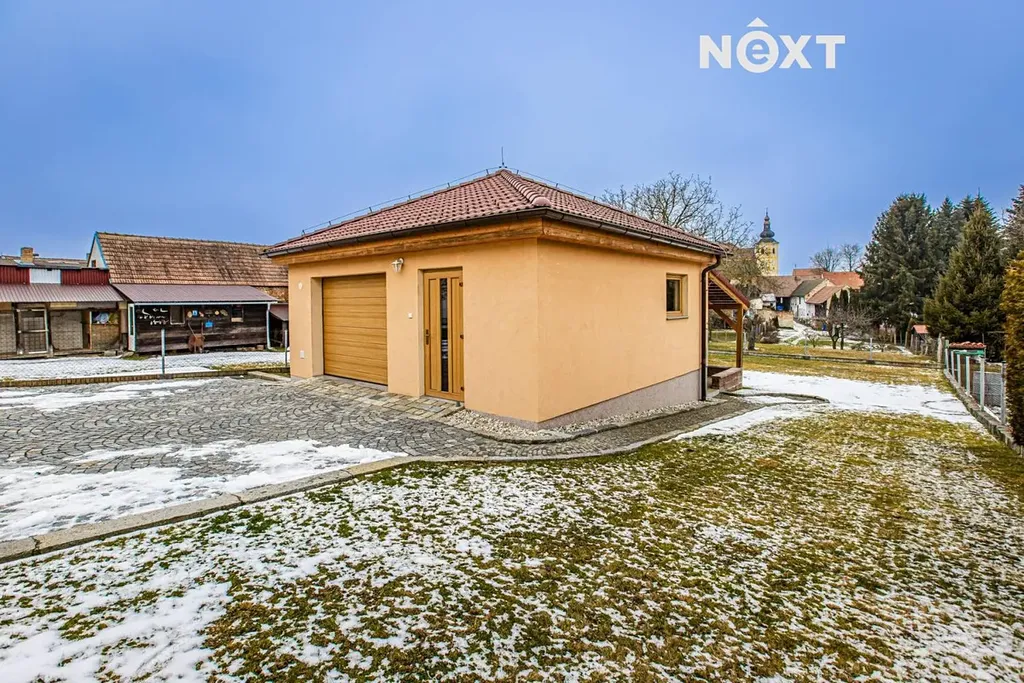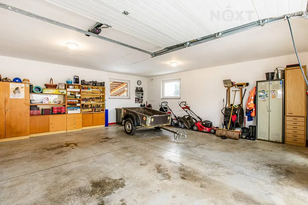 Významnou předností nemovitosti je prostorná garáž pro dvě auta, která je současně využívána jako dílna a nabízí dostatek místa pro hobby či skladování. Ke garáži je příjezd po zpevněné ploše. Za garáží se nachází zastřešená pergola s příjemným výhledem do zahrady a na věž místního kostela, ideální místo pro posezení a relaxaci.