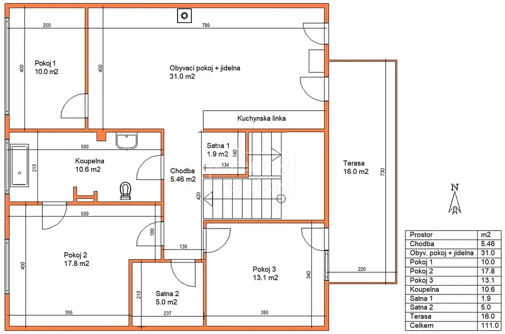Vstupní chodba s podlahovým topením o ploše 5,5 m2, zde je umístěno výklopné schodiště na půdu, šatna1 1,9 m2, se světlíkem do schodišťového prostoru, šatna2 5,0 m2, obývací pokoj 31m2, s krbovými kamny, jídelnou, se vstupem na terasu, kuchyňská linka s vestavěnými spotřebiči zn. Siemens a Liebherr, pokoj1 10m2, otočen do ulice, pokoj2 17,8m2, se vstupem do koupelny, pokoj3 13,1m2, se vstupem na terasu, pokoj3 je otočen na východní stranu, tzn. do zahrady, prostrorná koupelna s podlahovým topením 10,6 m2. Terasa je otočena na východní stranu, a má plochu 16m2, tuto terasu můžete v klidu užívat k nerušené relaxaci od jara do podzimu.