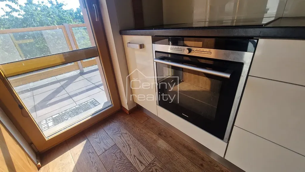 V bytě jsou luxusní dřevěné dubové podlahy, designové dveře, kuchyňská linka a nábytek na míru.