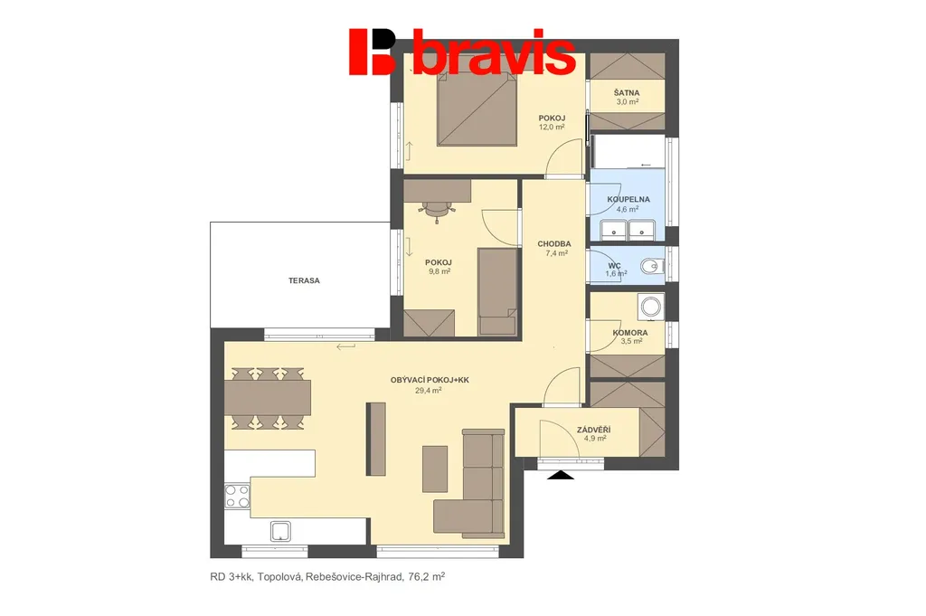 Obývací pokoj s kuchyňským koutem: krásná a otevřená obývací část o ploše 29,4 m2 je propojena s kuchyní a nabízí přímý vstup na zahrádku.