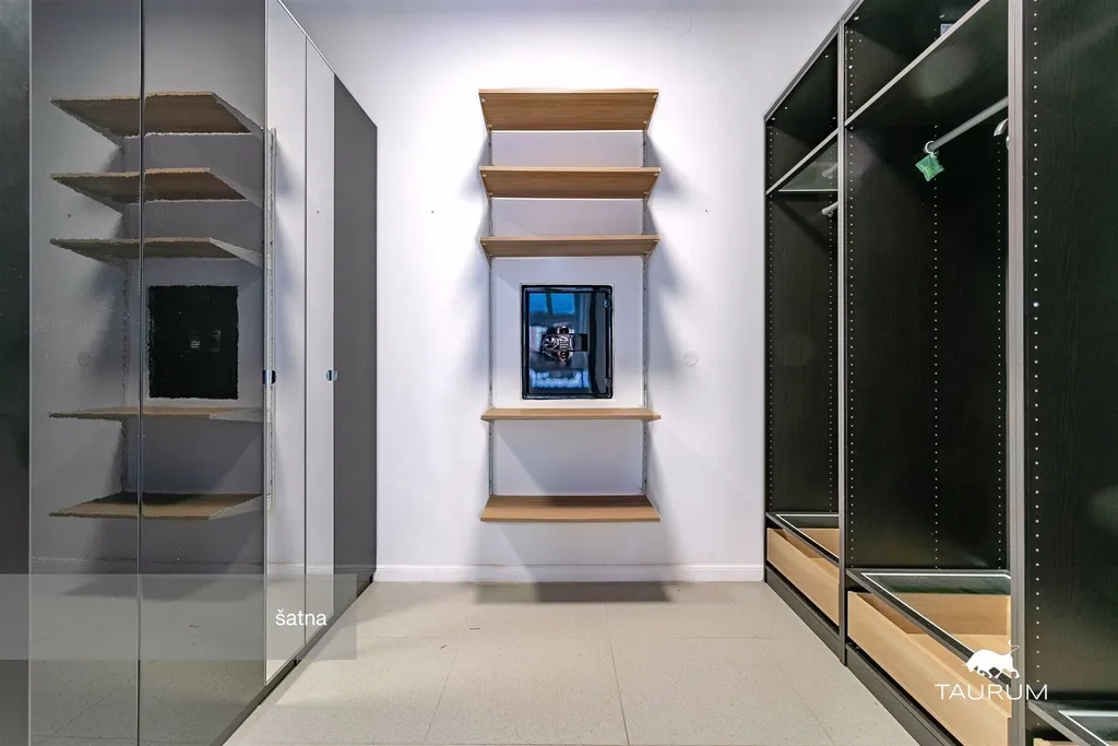 Byt dále disponuje dvěma samostatnými šatnami a velkými vestavěnými skříněmi. Luxusní koupelna je navržena s důrazem na detail – najdete zde kvalitní materiály a elegantní design.