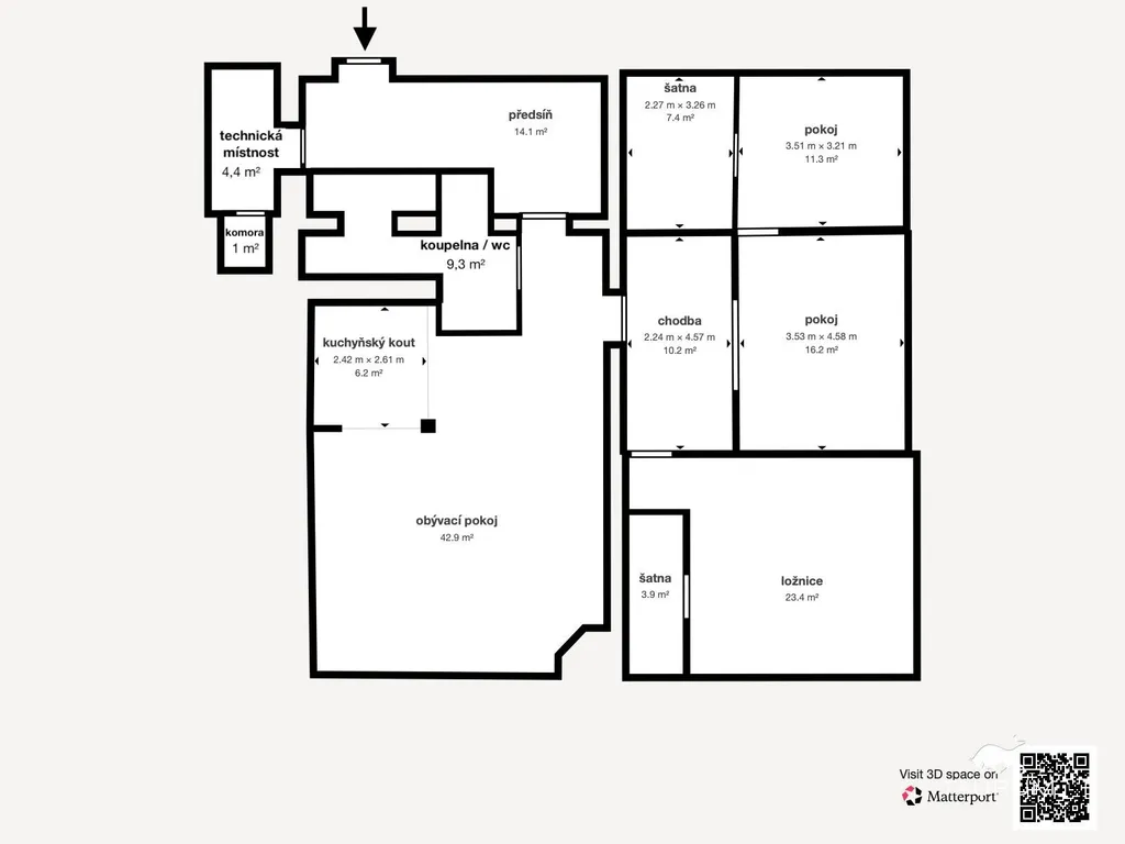 Aktuální dispozice bytu je 4+kk s velkorysou výměrou podlahové plochy 157m². Světlý a prostorný obývací pokoj s krbem a kuchyňským koutem, kde jsou okna směrována na západ do vnitrobloku. Předsíň s designovým nábytkem na míru, který poskytuje dostatek úložného prostoru. Koupelna se sprchovým koutem, ve které je jak ruční sprška, tak i velká hlavová sprcha s tropickým deštěm a vodopádem a umyvadlo na kamenné desce. Byt má nyní tři pokoje, z čehož jsou dva neprůchozí, a právě ty mají přímý vstup do šatny, ve kterých je trezor s číselným i biometrickým zámkem. Všechny tři pokoje mají okna orientována na východ a jsou krásně světlé. V neposlední řadě má byt technickou místnost s plynovým kotlem a komoru.