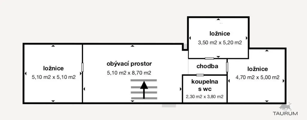V patře jsou tři ložnice, obývací prostor a koupelna s toaletou.