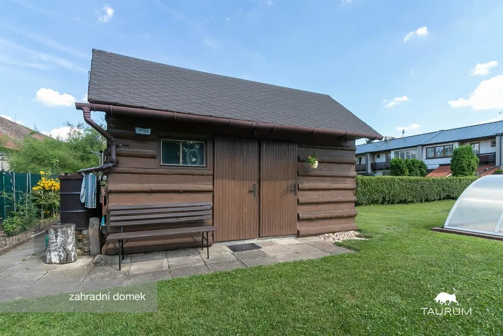 Z kuchyně nebo i přímo z prostoru pro parkovací místa jsou přístupy na krásnou, velkou, rovinatou a udržovanou zahradu, kde je možné posezení jak pod pergolou s krbem, tak na lavičce pod vzrostlým jehličnanem. Najdete tam též plně funkční bazén a zahradní domek, který je rozdělen na obytnou a užitnou část.