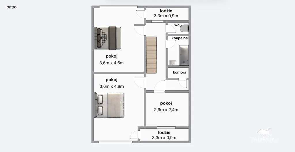 V patře jdou pak další 3 pokoje, samostatné wc, koupelna, komora a vstupní otvor na půdu.