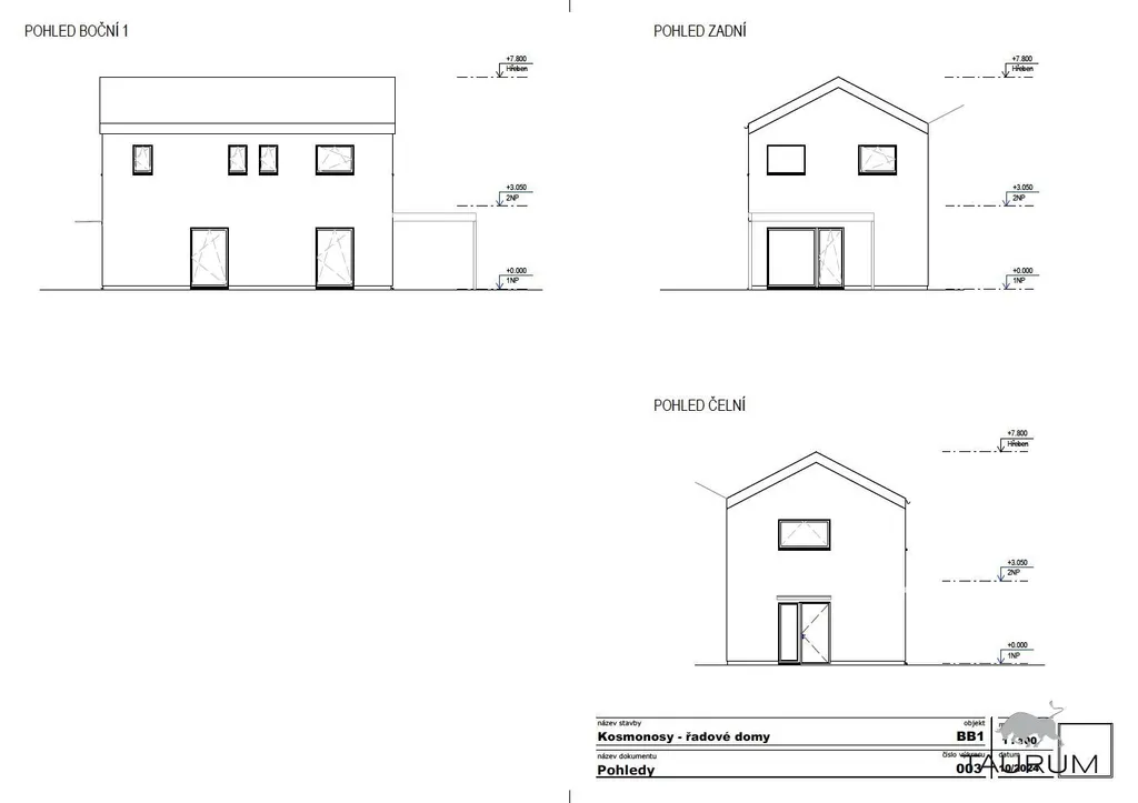 Dům č. 3 je řadový dvojdům o dispozici 5+kk a ploše 105 m2, stojící na pozemku o výměře 445 m2. Je možné objednat i prodlouženou variantu domu, která má plochu domu 120 m2. V domě jsou 4 samostatné pokoje, 1 obývací pokoj s kuchyňským prostorem, 2x koupelna s WC, další samostatné WC, šatna, úložný prostor pod schodištěm a místo pro technologie.