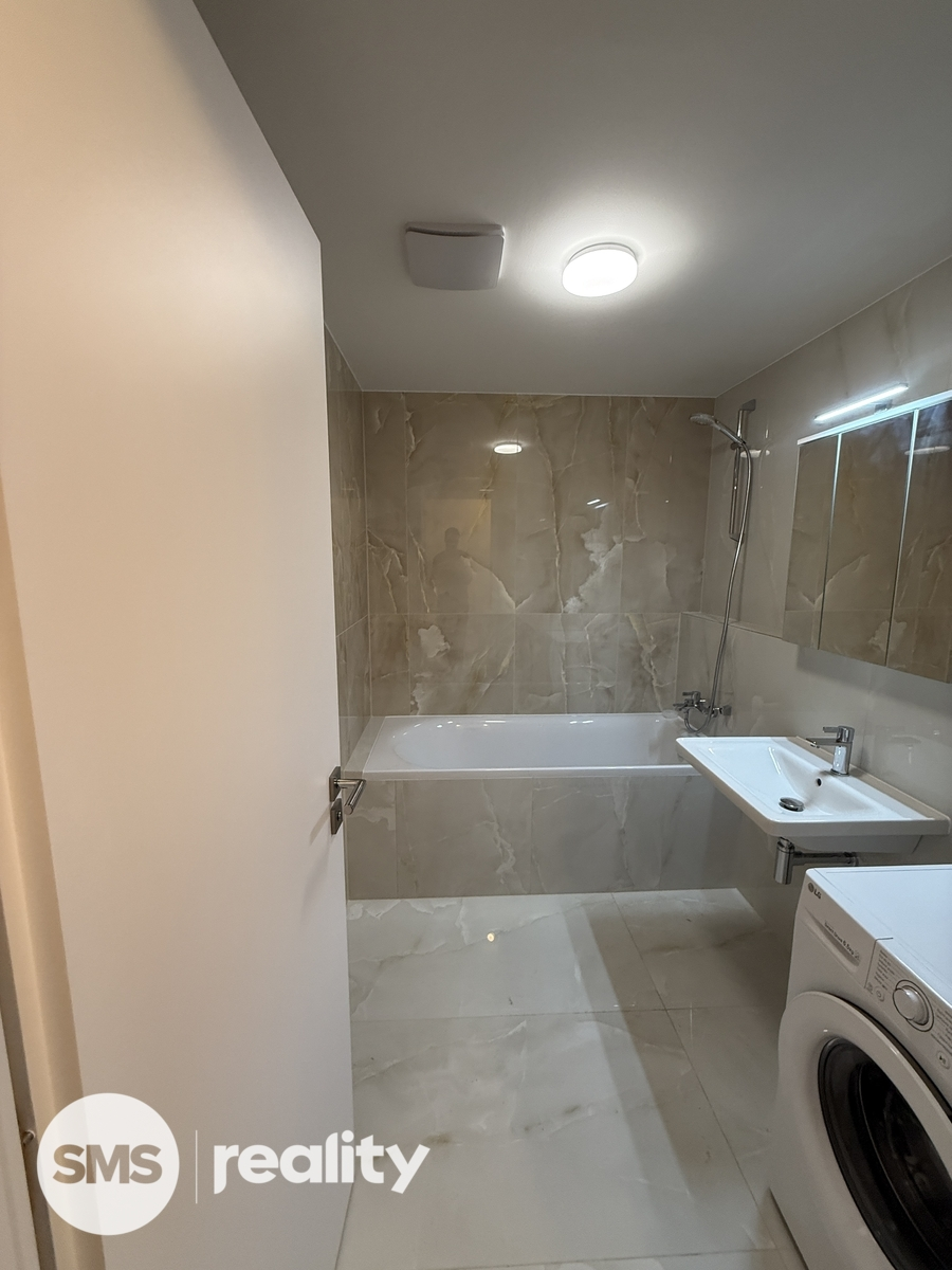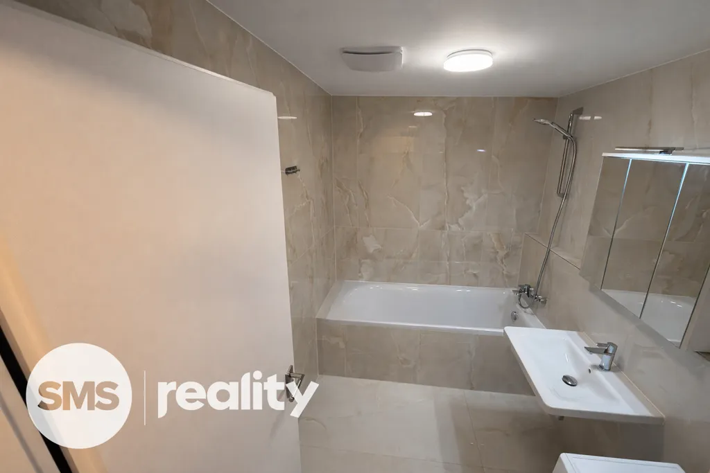 Součástí bytu jsou předokenní žaluzie s možností ovládání přes mobilní telefon, které vám zajistí maximální komfort a soukromí. Kuchyňská linka na míru s kompletními vestavěnými spotřebiči zn. Bosch (myčka, trouba, lednice s mrazákem, indukční varná deska). Do bytu vstupujete prostornou chodbou o výměře 9,8 m². Obývací prostor s kuchyní má výměru 28,6 m², ložnice 14,2 m². Výhodou je prostorná koupelna s vanou 5 m² a samostatná toaleta 2 m², šatna 5 m².