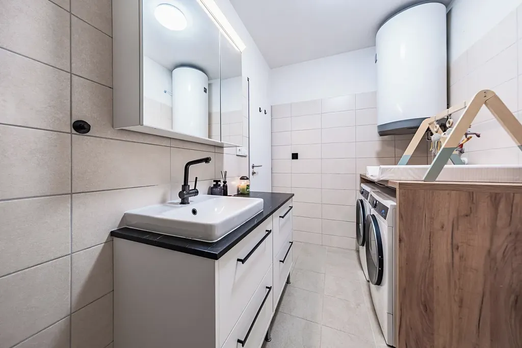 K domu náleží tři parkovací stání na vlastním pozemku, přičemž jedno parkovací stání je přímo k tomuto bytu. Další parkování je možné pohodlně v okolí. Bonus navíc představuje příprava na nabíjení elektromobilů, společná technická místnost a úklidová komora.