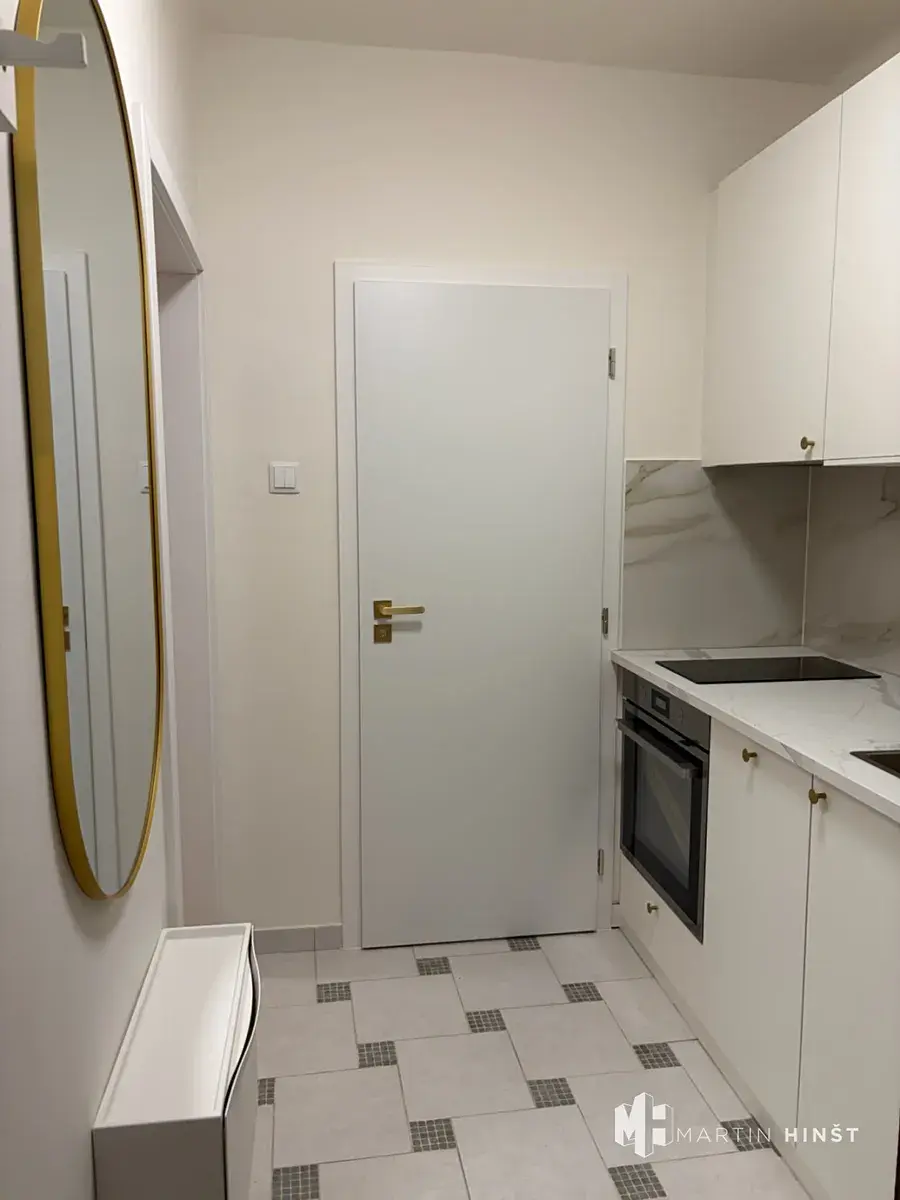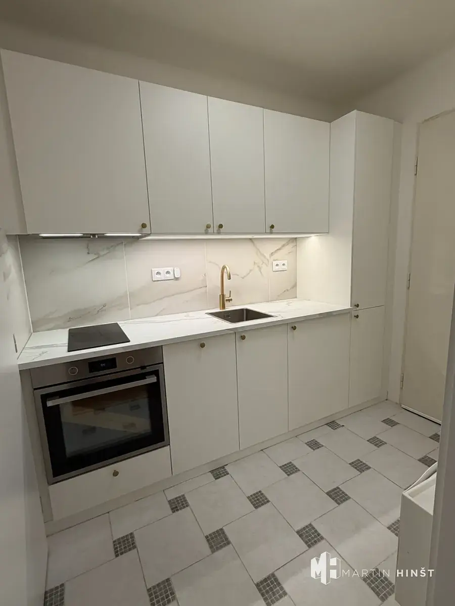 Interiér bytu je vybaven novou kuchyňskou linkou se spotřebiči, mezi které patří lednice, myčka nádobí, elektrická trouba a sklokeramická varná deska. Obytný prostor je prakticky řešen a doplněn vestavnou skříní, na podlahách jsou kvalitní parkety. Koupelna je rovněž po rekonstrukci a disponuje menší vanou, umyvadlem a toaletou. Ohřev vody je zajištěn bojlerem, vytápění řešeno elektrickými přímotopy.