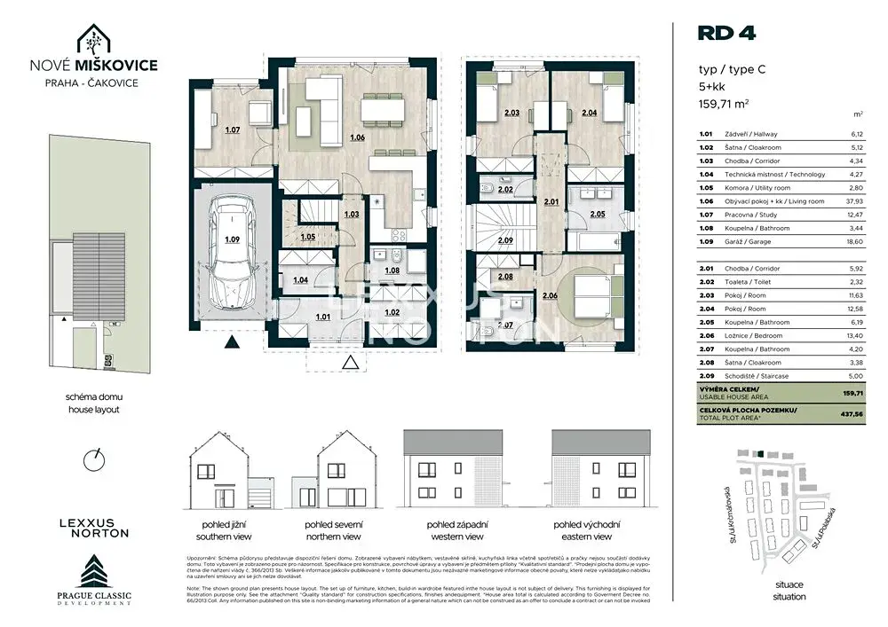 Nabízíme k prodeji prostorný rodinný dům o dispozici 5+kk v rezidenčním projektu Nové Miškovice, který vyniká velkorysou užitnou plochou 159,71 m² a vlastním pozemkem o velikosti 437,56 m². Dispozice domu je navržena s důrazem na pohodlný rodinný život, dostatek soukromí a přirozené propojení interiéru se zahradou.