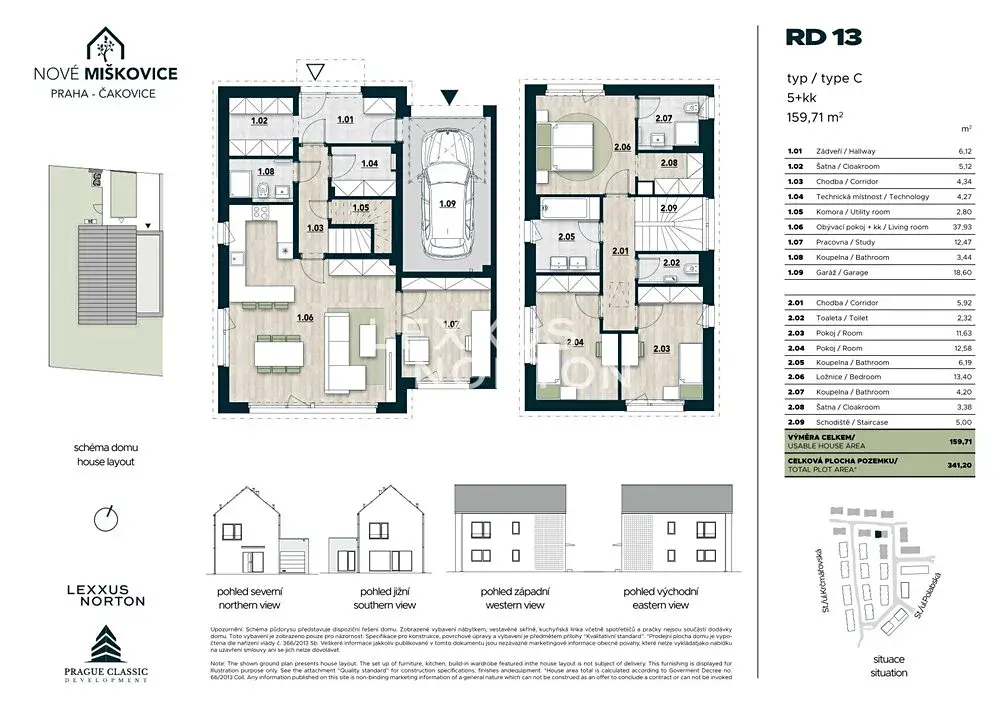 Nabízíme k prodeji prostorný rodinný dům o dispozici 5+kk v rezidenčním projektu Nové Miškovice, který vyniká velkorysou užitnou plochou 159,71 m² a vlastním pozemkem o velikosti 341,20 m². Dispozice domu je navržena s důrazem na pohodlný rodinný život, dostatek soukromí a přirozené propojení interiéru se zahradou.