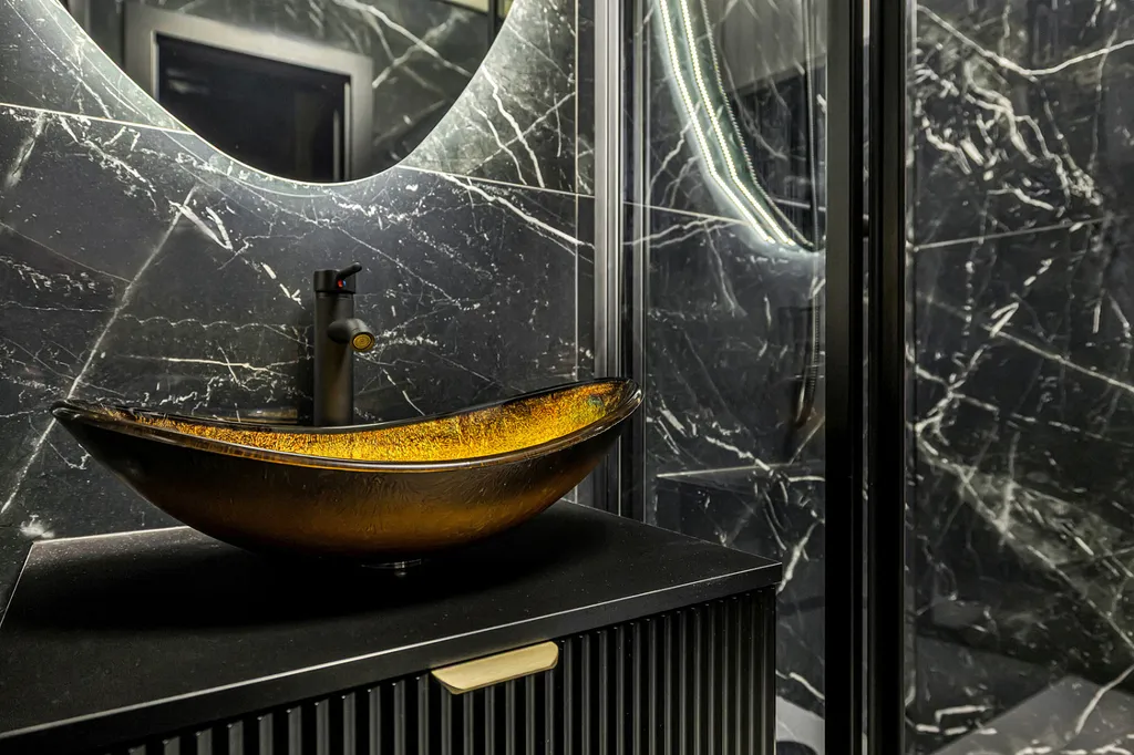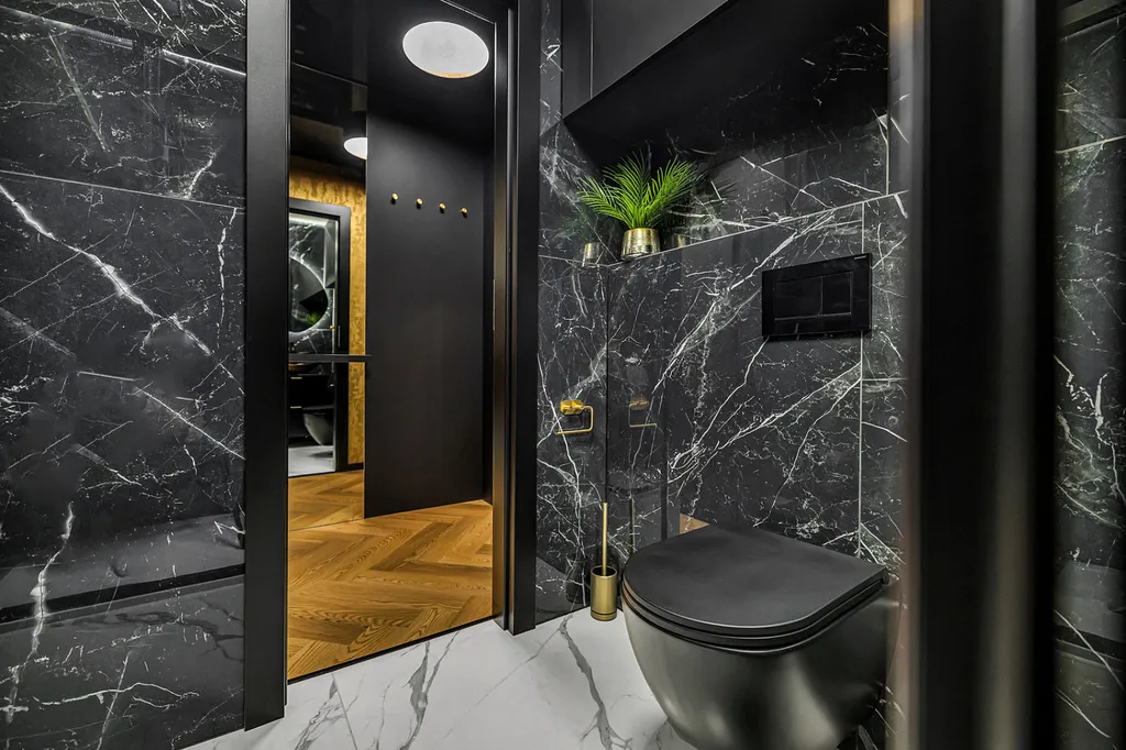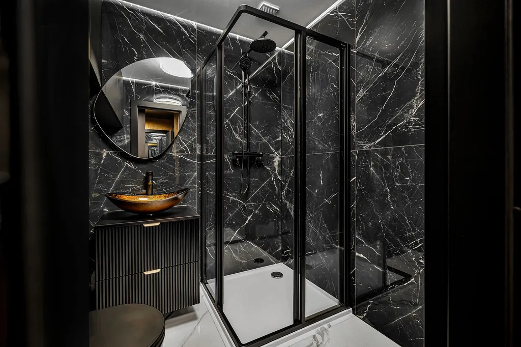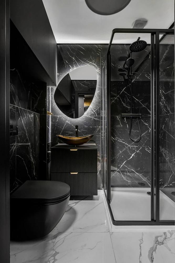 • Luxusní koupelna – velkoformátová dlažba, prémiová sanita, podsvícení, které vytváří wellness efekt.