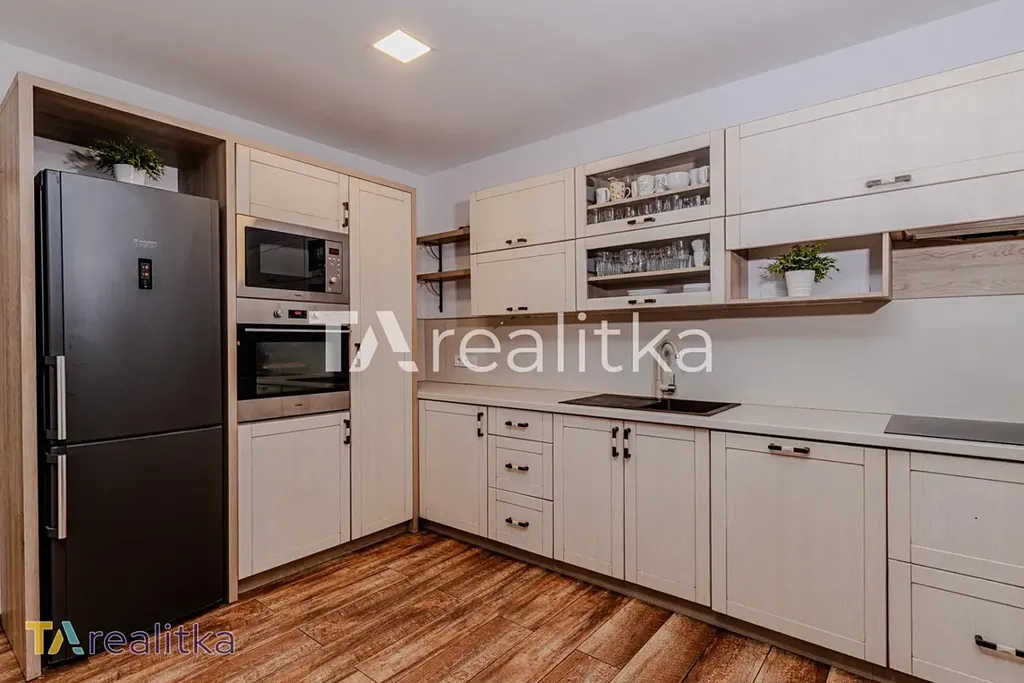 Dispozice 4+kk: zádveří se vstupní chodbou, prostorný obývací pokoj s kuchyní, tři samostatné pokoje, šatna, technická místnost, koupelna s vanou i sprchovým koutem a také WC