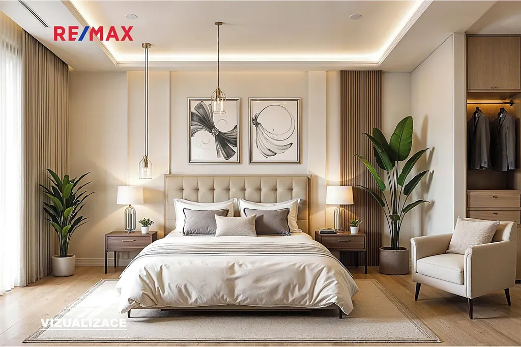 - hlavní ložnice se šatnou a soukromou koupelnou (sprchový kout, WC)
