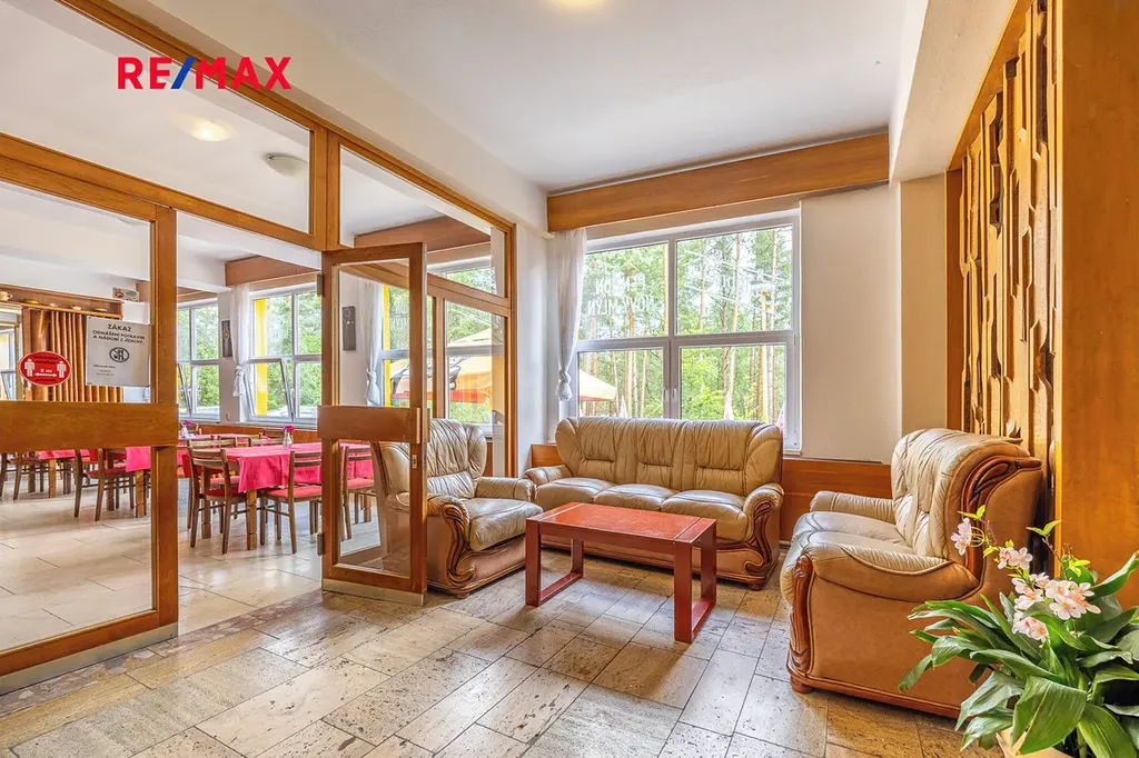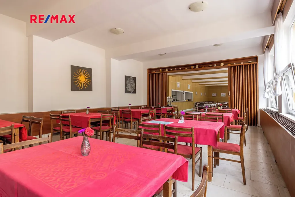 Uvnitř penzionu se nachází vybavená jídelna s kapacitou pro 150 osob, dvě společenské místnosti a prostorný multifunkční sál, ideální pro cvičení, projekce, divadelní představení či firemní akce. Kvalitně vybavená kuchyně umožňuje zajištění stravovacích služeb. Součástí komplexu je také bar s příjemným posezením a terasa v 1. patře, která slouží k odpočinku. Dále je k dispozici samostatná recepce/kancelář a soukromý byt 3 + 1 s vlastním vstupem vhodný pro správce nebo majitele. Menší posilovna se sprchami přidává další hodnotu této nabídce.