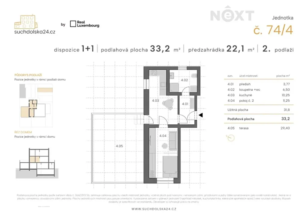 Jednotka se skládá z pokoje o ploše 11,25 m², kuchyně s přípravou pro kuchyňskou linku o ploše 10,25 m², kompletně zařízenou koupelnou s toaletou a podlahovým vytápěním o ploše 6,57 m² , předsíní o ploše 3,77 m² a velkorysé terasy o ploše 29,4 m². K jednotce náleží zahrádka o ploše 22,1 m².