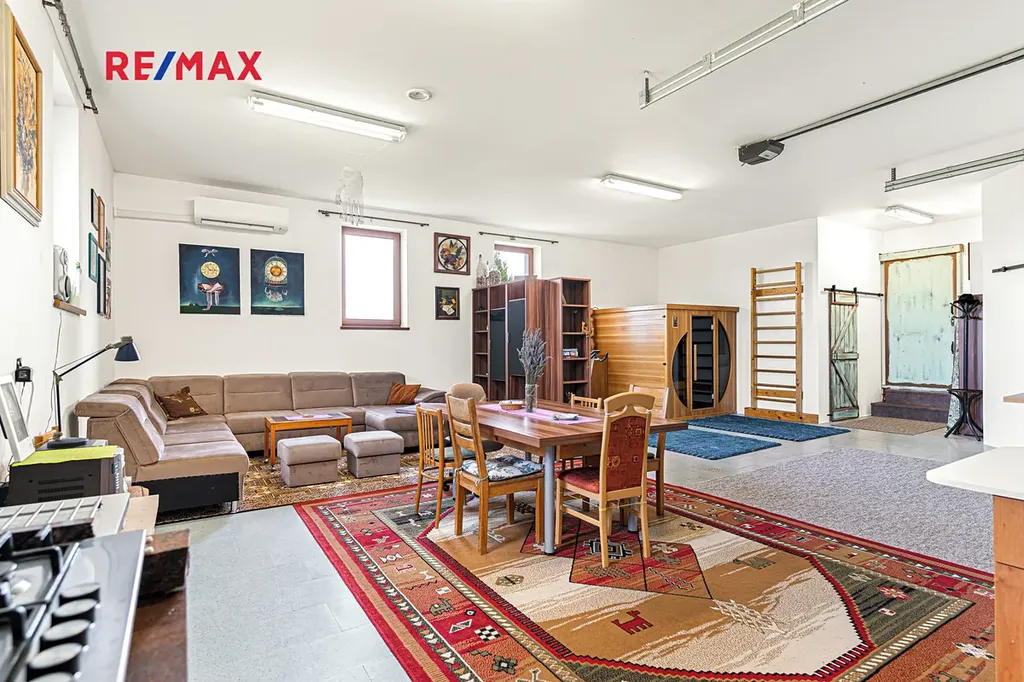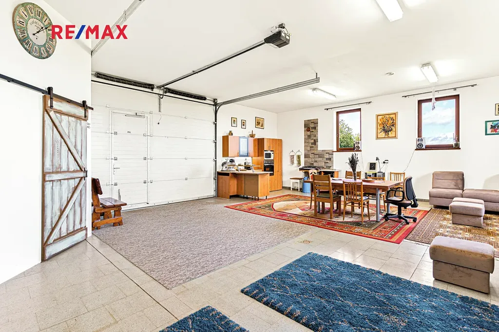• Víceúčelová hala (95 m²) s výškou stropu cca 3,3 m – ideální pro např. autoservis, dílnu, sklad, parkování obytného vozu či podnikání
