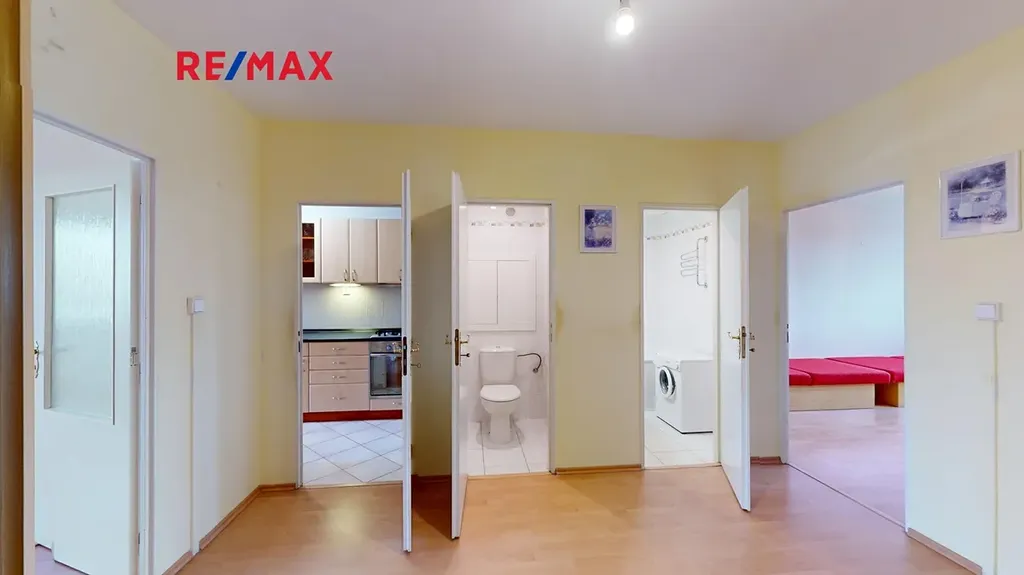Dispozice je: obývací pokoj s východem do zasklené lodžie + kuchyňský kout, 2 samostatné pokoje, koupelna s vanou, toaleta, šatna, chodba s vestavěnými skříněmi.