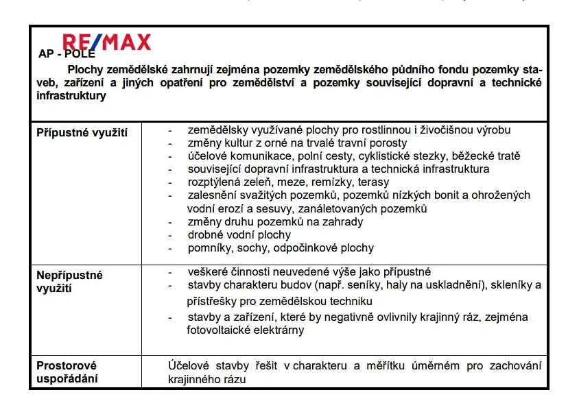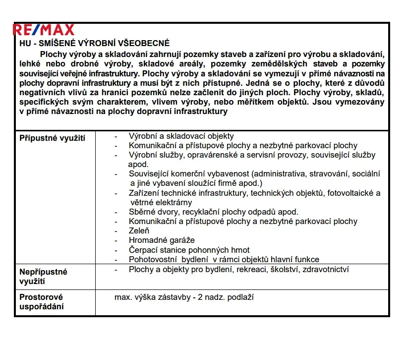 Přípustné využití ploch HU - Výrobní a skladovací objekty; Komunikační a přístupové plochy a nezbytné parkovací plochy; Výrobní služby, opravárenské a servisní provozy, související služby apod.; Související komerční vybavenost (administrativa, stravování, sociální a jiné vybavení sloužící firmě apod.); Zařízení technické infrastruktury, technických objektů, fotovoltaické a větrné elektrárny; Sběrné dvory, recyklační plochy odpadů apod.; Komunikační a přístupové plochy a nezbytné parkovací plochy; Zeleň; Hromadné garáže; Čerpací stanice pohonných hmot; Pohotovostní bydlení v rámci objektů hlavní funkce.