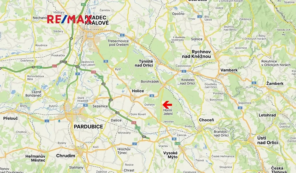 Vynikající dopravní dostupnost do Prahy, Pardubic a Hradce Králové.