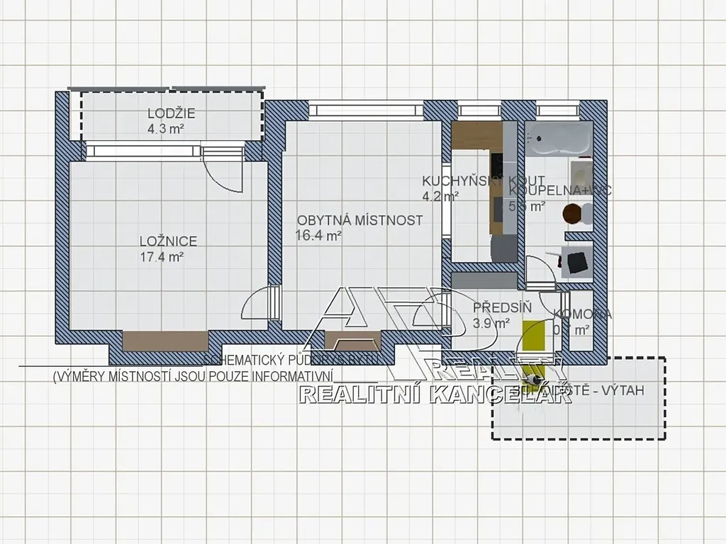 Dispozice bytu: obývací pokoj [16,4m2], kuchyňský kout [4,2m2], pokoj/ložnice [17,4m2] s lodžií [4,3m2], předsíň [4,6m2] a koupelna s WC [5,4m2]. K bytu je k dispozici sklepní kóje v 1.PP (suterén) domu o výměře cca [1,8m2]. Topení v bytě centrální / ústřední dálkové (podlahové), podružné měření spotřeby teplé a studené vody (vodoměry), samostatné měření spotřeby elektřiny (elektroměr). V bytě je možnost připojení internetu a STA.