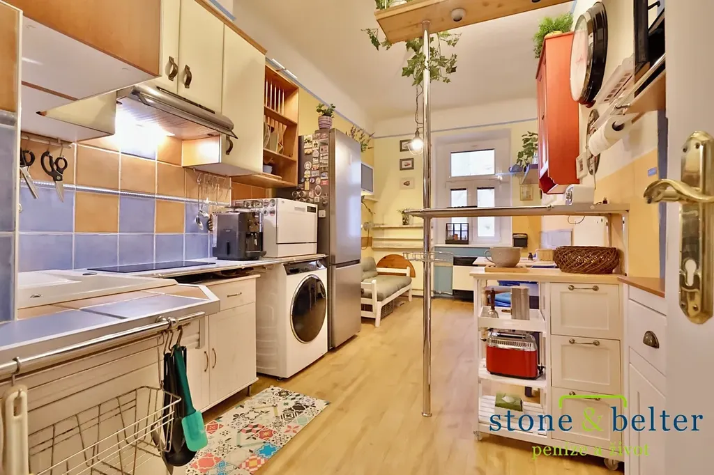Světlý byt 1+1 o rozloze 49 m² umístěn ve 4 patře domu s výtahem překvapí klidem i praktičností. Dominantou je velkorysý obývací pokoj 21,6 m². Samostatná kuchyně 15,8 m², která s přehledem pojme posezení i jídelní stůl. Navazuje komora 0,9 m² a  v centrální chodbě (7,4 m²) se nachází i koupelna 2,8 m² a samostatné WC 0,9 m².