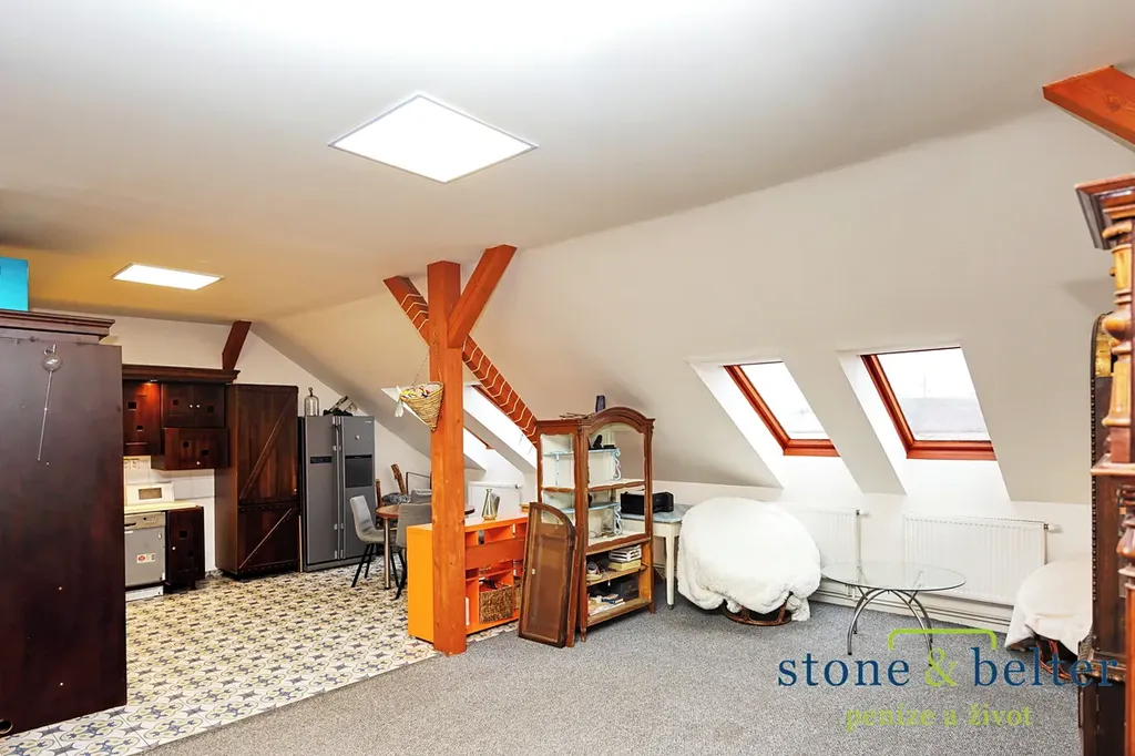 - byt 1+1 (obývací pokoj - 46 m2; kuchyň - 26 m2; koupelna + 2 WC - 13 m2)