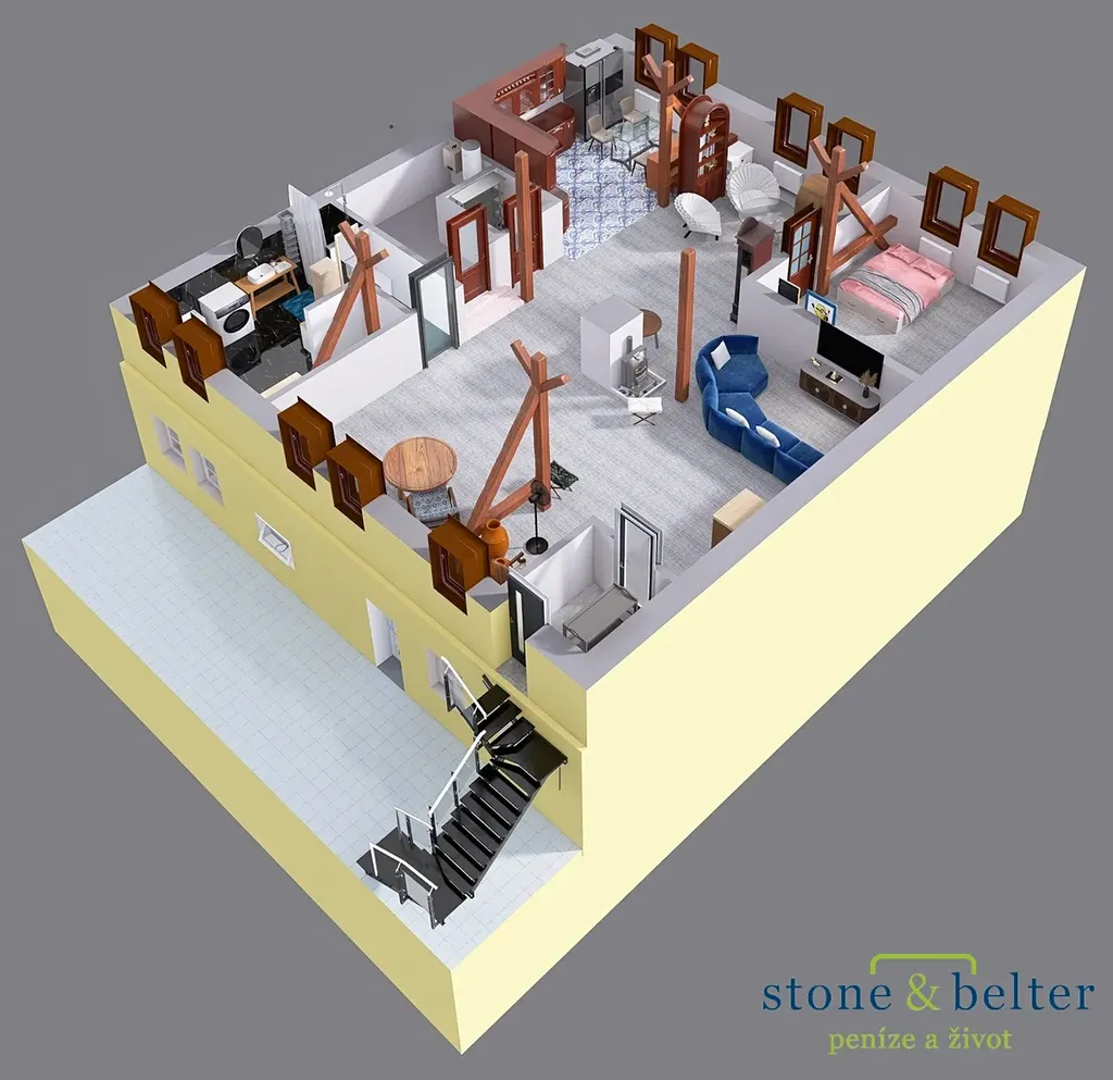 V každém patře se nachází samostatná, nadprůměrně velkoryse řešená bytová jednotka, ideální pro dlouhodobé i krátkodobé ubytování. V přízemí dům nabízí další bytovou jednotku – garsonku – a zároveň komerční prostor s přímým vstupem z náměstí, perfektní pro obchůdek, kavárnu, služby či jinou provozovnu, která těží z přirozeného pohybu lidí v centru města.