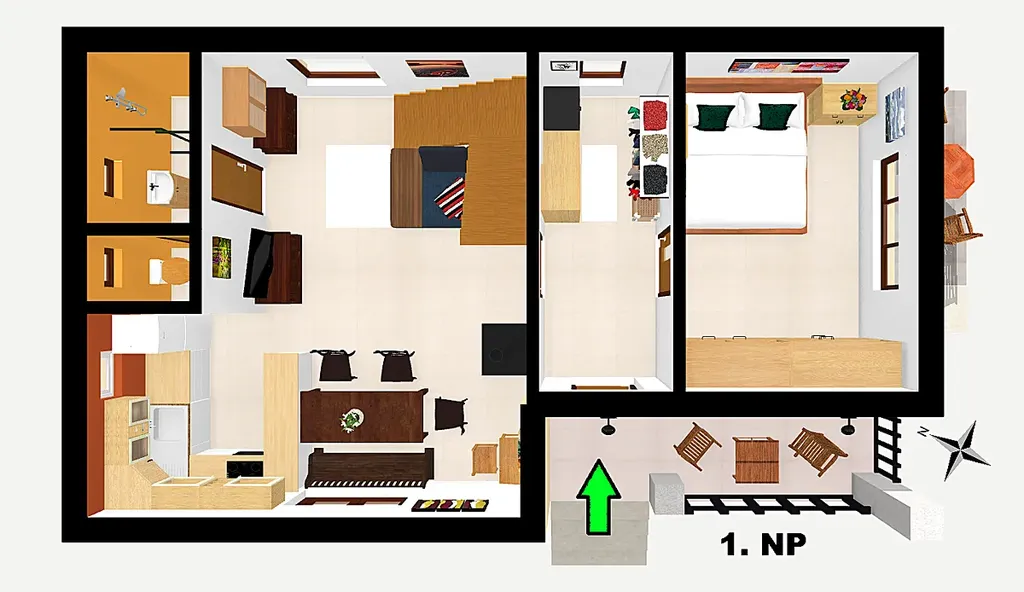 Dispozice zahrnuje čtyři pokoje, kuchyňský kout, koupelnu s prostorným sprchovým koutem a WC. Samozřejmostí je také sklep o velikosti 9 m², který je využíván jako dílna a také malý sklípek pod chodbou v přízemí. Další úložný prostor se nachází pod vstupní terasou a úložné možnosti nabízí také pochozí půda, která je nad celým druhým nadzemním podlažím. Dům je plně vybavený.