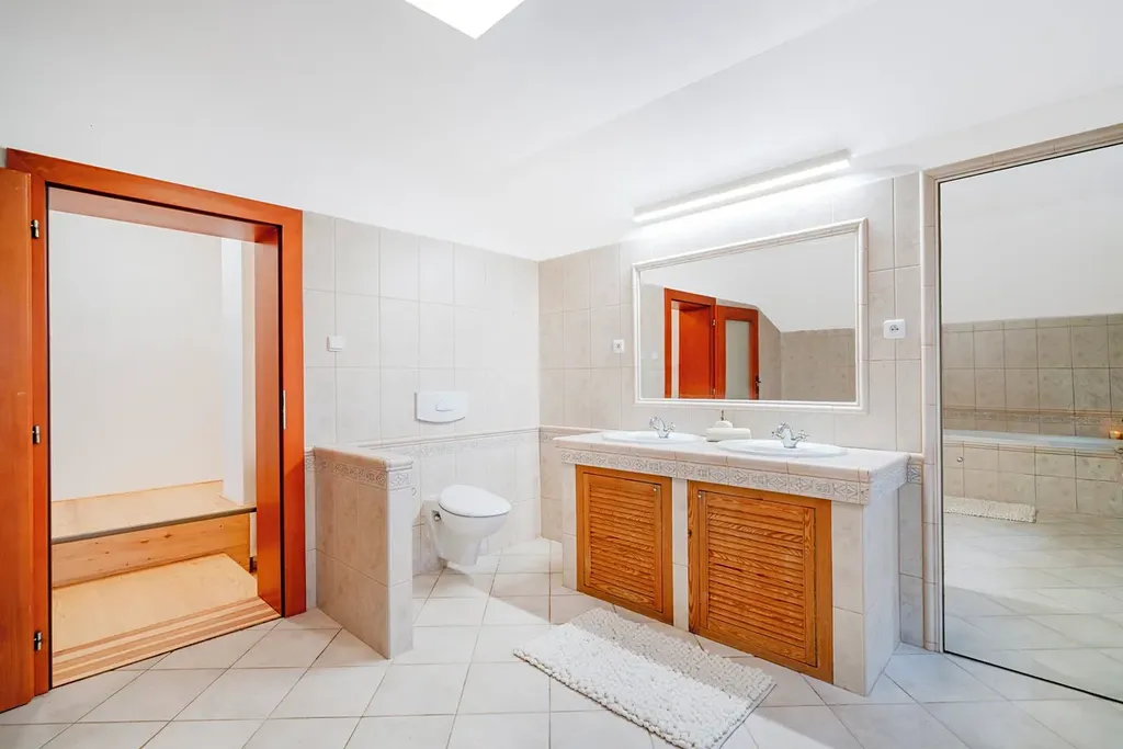 Přízemí: kuchyně, obývací pokoj, koupelna se sprchou a WC, chodba, sauna s relaxační místností a sprchou