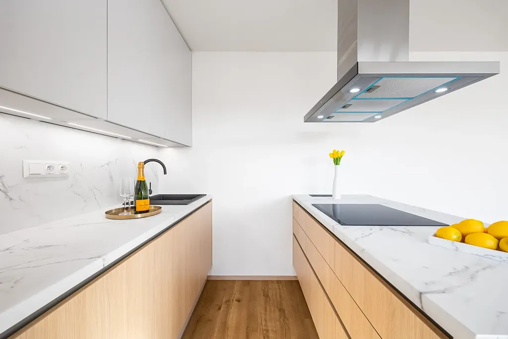 Dominantou bytu je prostorný obývací pokoj s kuchyní na míru a moderním ostrůvkem o celkové ploše 33 m². Kuchyň je plně vybavena vestavnými spotřebiči (elektrická trouba, mikrovlnná trouba, indukční deska, myčka) a přirozeně navazuje na obytný prostor. Koupelna je řešena velmi velkoryse – nabízí vanu, samostatný sprchový kout, podlahové vytápění s digitálním termostatem, elegantní topný žebřík i designové umyvadlo se skříňkou.