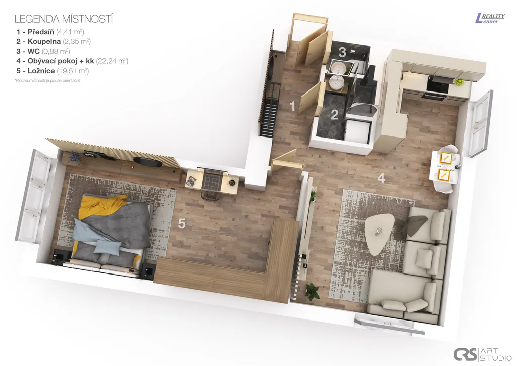 Byt má k dispozici: předsíň, prostorný ob. pokoj s kuch. koutem 22,24 m2, ložnice 19,51m2, koupelna se sprchovým koutem, samostatná toaleta s WC Geberit.