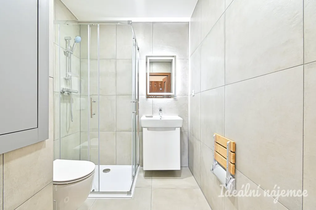 V koupelně se nachází sprchový kout, umyvadlo, zrcadlo a wc. V bytě jsou plovoucí podlahy.