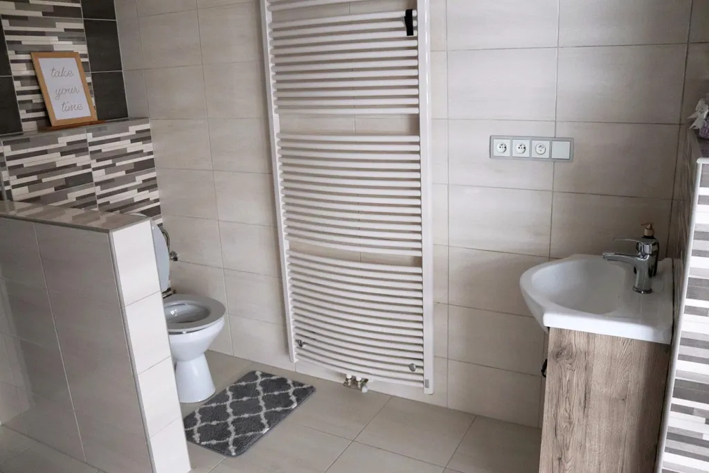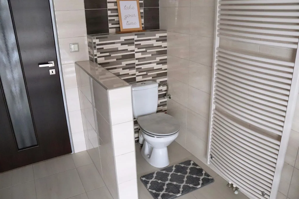 plnohodnotná koupelna se sprchovým koutem a toaletou