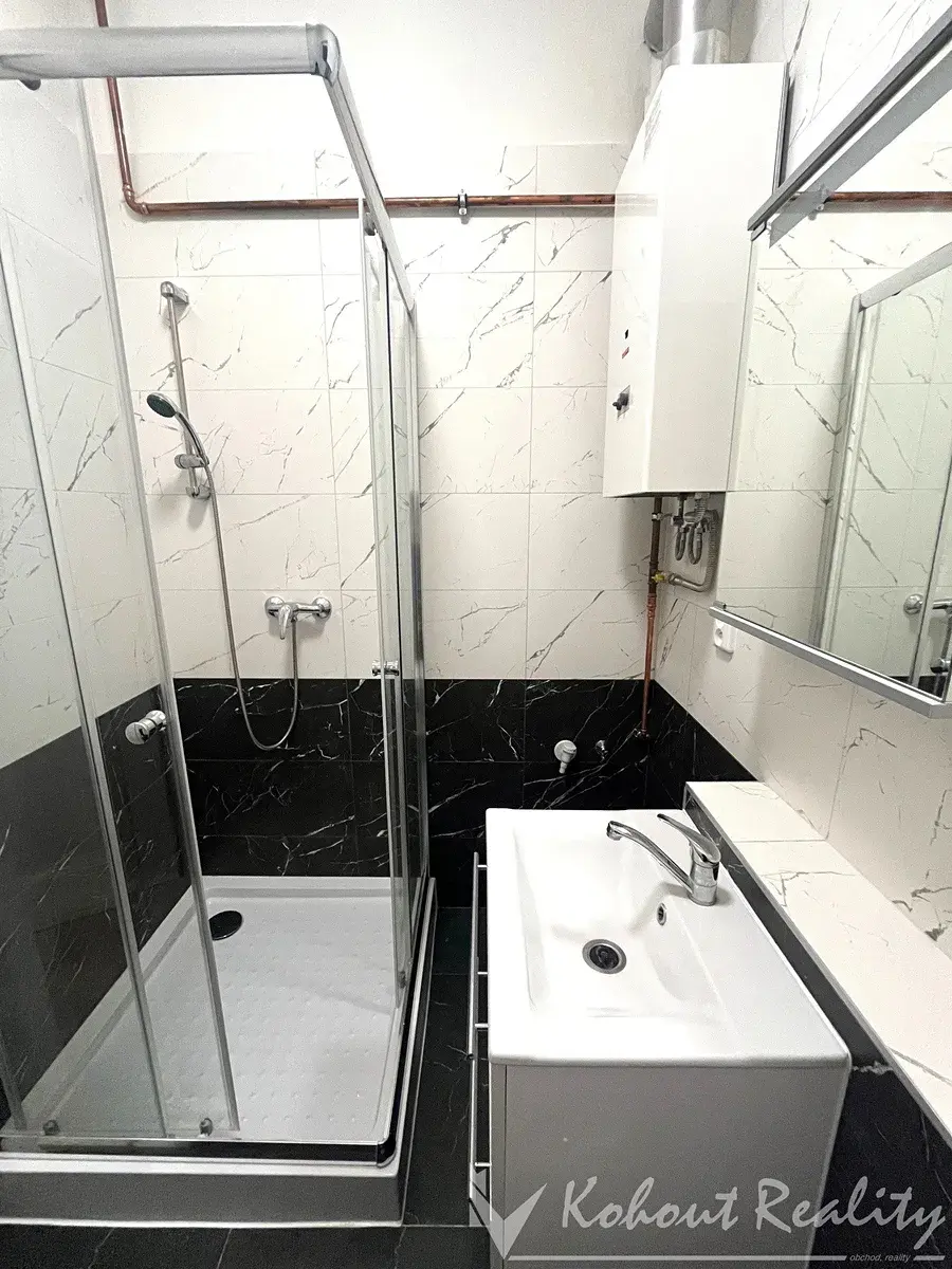 Koupelna je moderně řešená se sprchovým koutem a přípravou na pračku, WC je součástí koupelny. V bytě je zaveden plyn – vytápění je řešeno pomocí dvou plynových vafek, ohřev teplé vody plynovou karmou. Připojení k internetu je zajištěno optickým kabelem.
