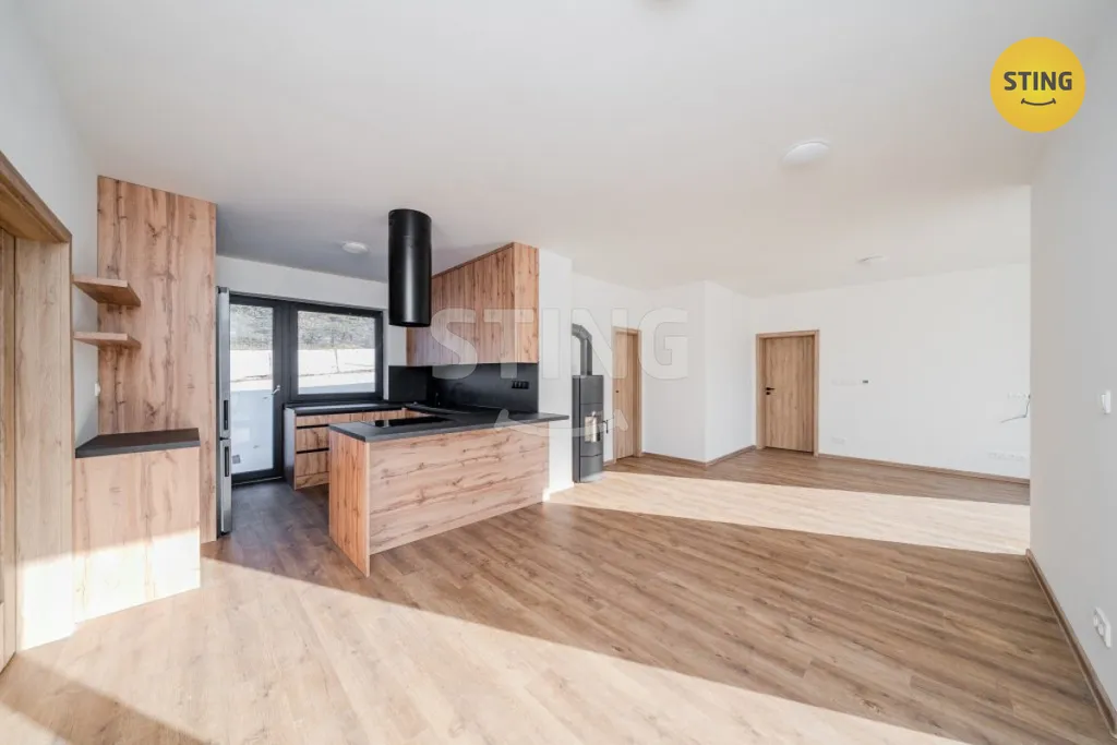 Interiér je laděn do moderního, nadčasového stylu v kombinaci dřeva a antracitových prvků, což vytváří útulné a elegantní bydlení bez nutnosti dalších investic.